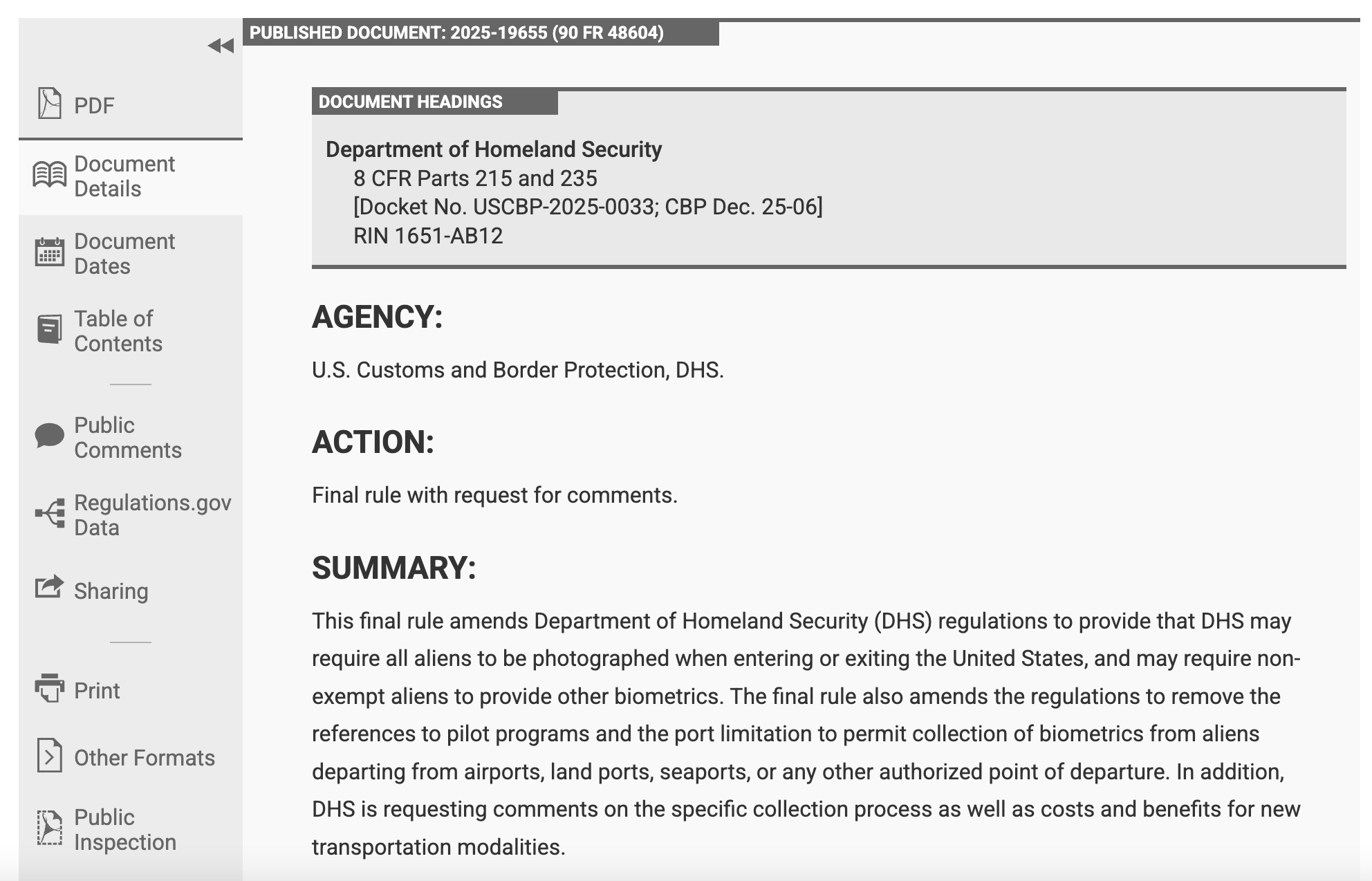 根据DHS在2025年10月27日公布的最终规则文件的内容来看,该新规将在 2025年12月26日正式生效。首批执行对象为主要国际机场和高流量陆路口岸。随着系统稳定运行,预计在未来3至5年内,覆盖美国所有的出入境口岸,包括私家机场与港口。
