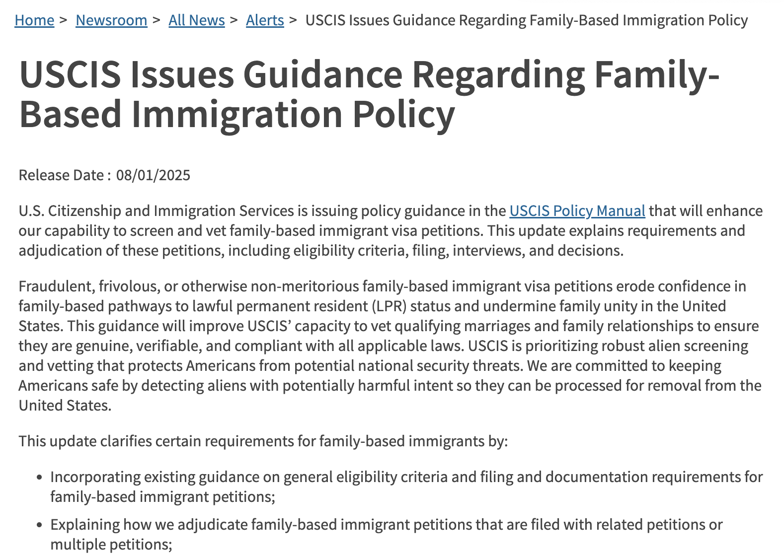 2025年USCIS发布了多份关于家庭类移民的内部指导文件和相关政策公告,明确要求对已经提交的申请进行更加严格的审核。包括申请材料的真实性、申请人的背景信息、婚姻动机等等。