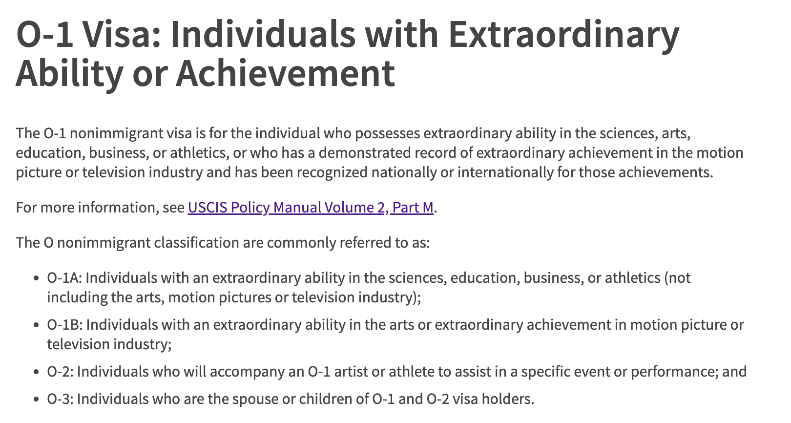 - O-1A:科学、教育、商业、体育等非艺术领域,通常需要受益人有科研成果、商业领导力以及对所在行业有重要贡献等可量化的成就;