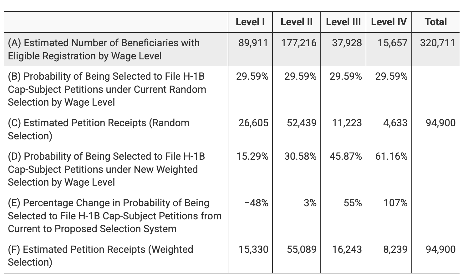 根据DHS拟议规则模拟数据显示,现行随机抽签模式下,所有受益人的中签概率约为 29.59%。而在加权抽签模式下,不同工资等级的中签概率会出现显著差异:Level 1约15.29%,Level 2约30.58%,Level 3约45.87%,Level 4高达 61.16%。也就是说,高工资的受益人中签概率几乎翻倍,而低工资的受益人将面临的竞争压力明显上升。